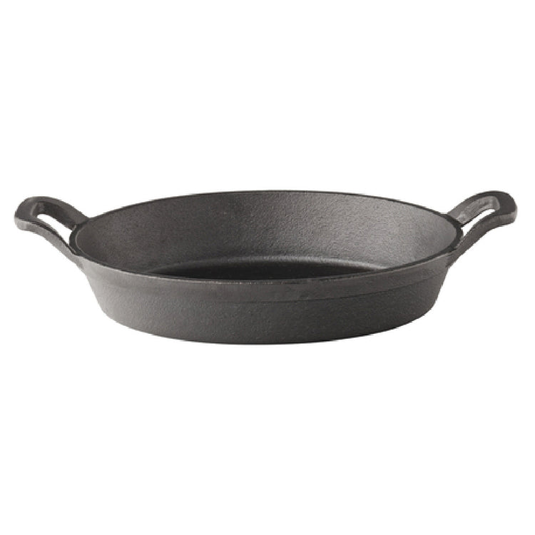 The Tableware Solutions USA MH7003 Au Gratin Dish is a versatile and durable kitchen essential, perfect for both professional chefs and home cooking enthusiasts. This dish boasts a substantial capacity of 38 ounces, making it ideal for a range of culinary creations. Measuring 9-7/16 inches, the dish's oval shape is designed to facilitate even cooking and presentation of au gratin recipes and other baked dishes. Its eared design adds a practical touch, ensuring easy handling, whether in a bustling restaurant kitchen or a cozy home setting. Crafted from robust cast iron, the MH7003 dish ensures superior heat retention and distribution, allowing food to cook evenly and remain warm for extended periods. Cast iron is known for its longevity and ability to withstand high temperatures, making this dish a reliable choice for oven-to-table service. Though it lacks a lid, its thoughtful design compensates with functionality and aesthetic appeal, making it a centerpiece for any table. Packed by six per case, this dish supports bulk purchasing for larger establishments, ensuring that culinary professionals are well-equipped to meet the demands of their clientele. The Tableware Solutions USA MH7003 Au Gratin Dish embodies quality and practicality, catering to diverse segments within the hospitality and food service industry.