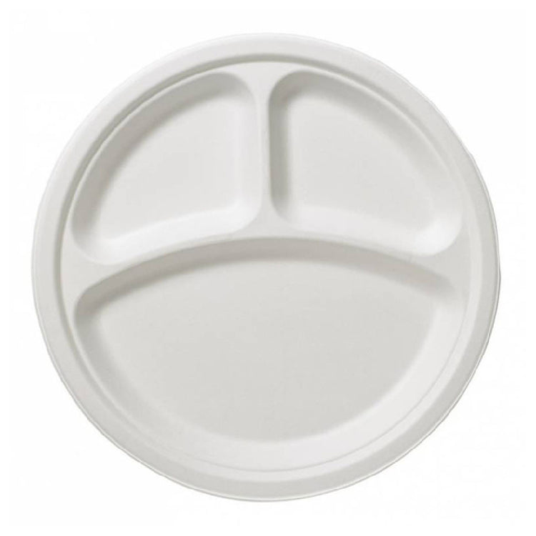Tableware Solutions USA Q2016 Disposable Plate 10-1/4" Dia. (26 Cm) Round is an innovative dining solution designed to meet the diverse needs of various market segments, including hospitality, catering, and environmentally conscious consumers. This round plate features a diameter of 10-1/4 inches (26 centimeters), providing ample space for a full meal presentation. It is thoughtfully crafted with three compartments, perfect for portion control and preventing food from mixing, making it ideal for buffets and events. The Q2016 plate is made from biodegradable and compostable cellulose pulp, aligning with sustainable practices and reducing environmental impact. Its pristine white color offers a clean and elegant appearance suitable for any event setting. Each case contains 50 plates, ensuring convenience and efficiency for bulk purchasing and storage. The Tableware Solutions USA Q2016 plate is a versatile and eco-friendly choice, offering both practicality and sustainability for businesses and individuals seeking high-quality disposable tableware solutions.