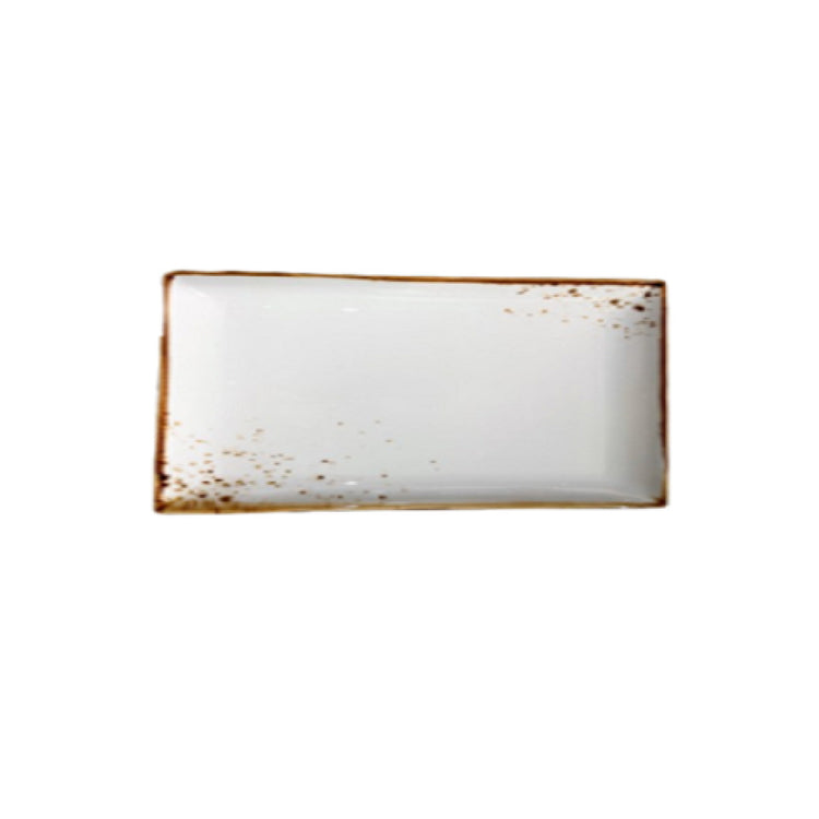 The Tableware Solutions USA TS-DG0174-01 Platter is a versatile rectangular platter measuring 35.5 x 25.4 cm or 14 x 10 inches, designed to meet the needs of diverse market segments, including hospitality and home dining environments. Crafted from vitrified porcelain, this platter combines durability with a rustic appeal, part of the Rustic Dapple collection, which adds a creative touch to table settings. Its construction ensures it is both microwave and dishwasher safe, making it a practical choice for busy kitchens where ease of use and maintenance are essential. The platter's crisp white finish provides a neutral backdrop that highlights culinary presentations, making it ideal for showcasing a variety of dishes from appetizers to desserts. Packed in cases of four, it is a suitable option for bulk purchasing, catering services, and event planners who require reliable and consistent tableware solutions. This product's technical specifications underline its robust nature and adaptability, serving as a testament to its suitability for both professional and personal culinary environments.
