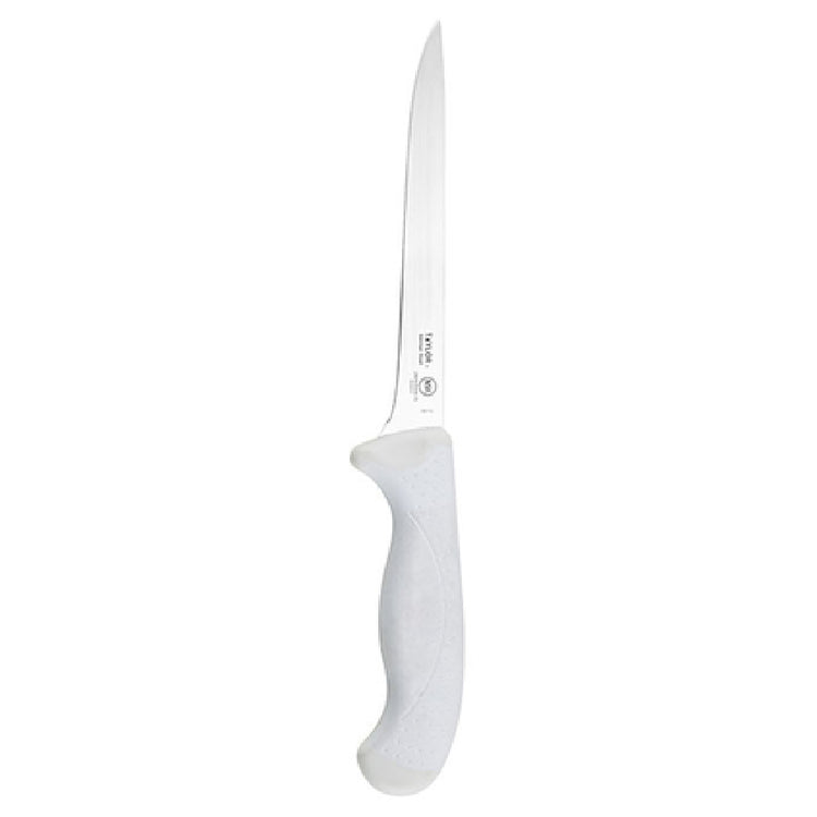 The Taylor 5248379 Fillet Knife - 11-7/16"L Overall 6" Blade is a precision-crafted tool ideal for culinary professionals and home cooks who value quality and durability. Featuring a 6-inch blade made from high carbon German steel, this knife ensures exceptional sharpness and stain resistance. The stamped construction of the blade enhances its lightweight feel, allowing for easy maneuverability during intricate filleting tasks. An ergonomic non-slip handle, combining nylon and silicone, provides a secure and comfortable grip, essential for maintaining control in wet or oily conditions. Dishwasher safe for effortless cleaning, this fillet knife meets NSF standards, underscoring its compliance with public health and safety requirements. The knife's overall length of 11-7/16 inches offers an optimal balance between reach and precision, making it suitable for a variety of filleting tasks from fish to poultry. Its durable white handle complements the kitchen aesthetic while highlighting its professional-grade design. Perfect for diverse market segments including restaurant kitchens, catering services, and enthusiastic home chefs, the Taylor 5248379 Fillet Knife combines functionality with elegance, ensuring consistent performance and reliability in demanding culinary environments.