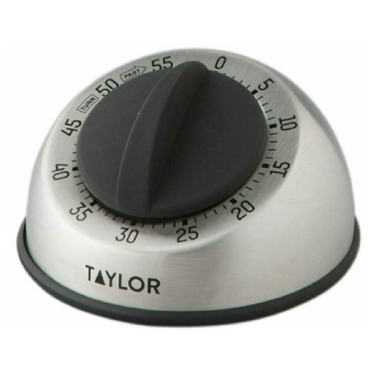 The Taylor 5830 Mechanical Timer 60 Minute With 9 Second Ring Stainless Steel is a precision timing instrument designed for a variety of culinary and professional applications. With a maximum setting of 60 minutes, this mechanical timer is ideal for tasks requiring precise time management. The inclusion of a 9-second ring ensures users are promptly alerted upon completion of the set duration. Its stainless steel construction not only provides a sleek and modern appearance but also contributes to the product's durability, making it a lasting addition to any kitchen environment. The timer features a rubberized knob, facilitating easy and comfortable adjustments. Additionally, the slip-proof base ensures stability during use, minimizing the risk of accidental movement and maintaining accuracy throughout timing sessions. This design is particularly beneficial in busy commercial kitchens where precision is key. The Taylor 5830 serves various market segments, from home cooks to professional chefs, offering reliable performance and easy integration into existing workflows. Its combination of practicality and robustness underscores its value in environments that prioritize both functionality and style.