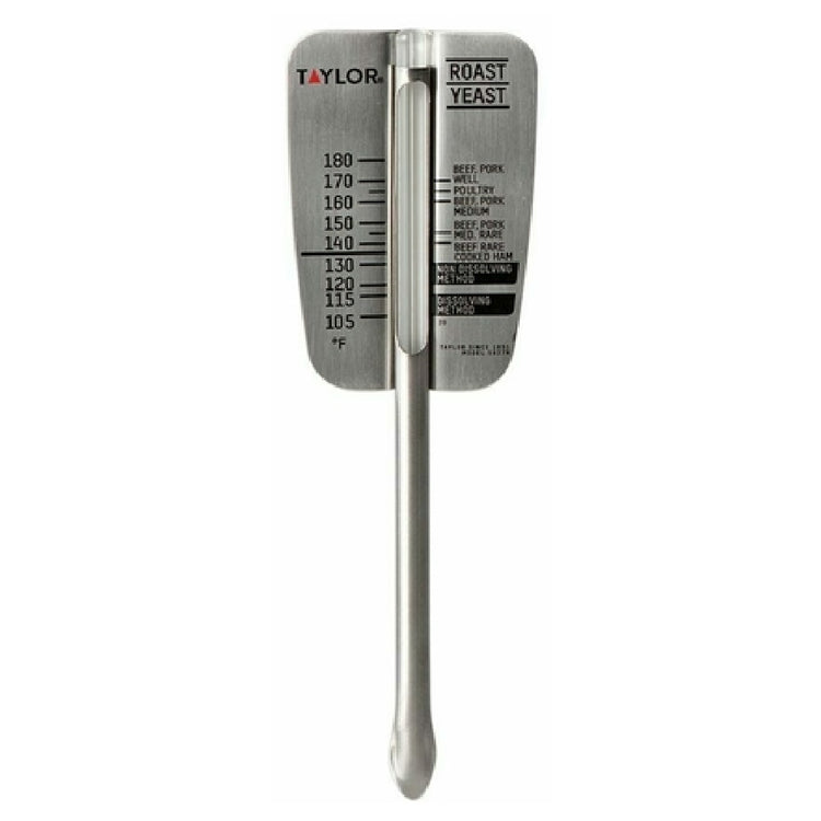 The Taylor 5937N Multi-Purpose Meat Thermometer is a highly functional kitchen tool, designed to meet the precise needs of culinary professionals and home chefs alike. This tube-type thermometer provides an accurate temperature range from 105°F to 185°F, making it ideal for a variety of cooking applications. The thermometer features an armored sabre-tipped tube filled with a non-toxic liquid, ensuring safety and durability in high-temperature environments. Constructed from stainless steel, the Taylor 5937N is built to withstand frequent use and is dishwasher safe for easy cleaning, enhancing convenience and hygiene. Packaged in a blister card, this thermometer is NSF certified, verifying its compliance with public health and safety standards. The Taylor 5937N is suitable for meat, poultry, and other culinary applications, making it a versatile asset for professional kitchens, catering services, and home cooks who require precise temperature monitoring. This thermometer's robust construction and precise measurement capabilities make it a reliable tool for achieving perfectly cooked dishes, catering to a wide range of users in the food industry seeking accuracy and safety in their cooking processes.