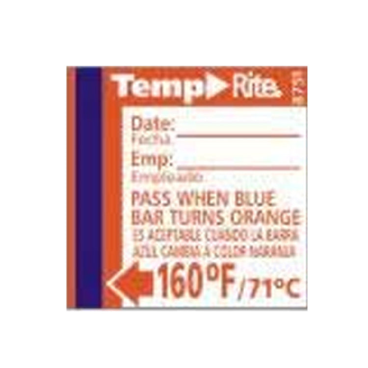 The Taylor 8751 Temperature Sensor TempRite® Stick-On Adhesive Dishwasher Labels are a precision-engineered solution for monitoring dishwasher temperatures, tailored for various industry sectors such as food service and healthcare. These labels are designed to measure temperatures with pinpoint accuracy, specified at +/-2°F, ensuring reliable performance in critical environments. Each pack contains 24 labels, each capable of detecting temperatures up to 160°F (71°C), making them indispensable for operations that require stringent temperature control to meet health and safety standards. The stick-on adhesive feature allows for convenient application to a variety of surfaces within dishwashing units, providing a hassle-free method to verify that sanitation protocols are being adhered to. These labels are particularly valuable for ensuring compliance with regulatory requirements in industries where maintaining specified temperature thresholds is crucial, such as in commercial kitchens and medical facilities. By integrating the Taylor 8751 Temperature Sensor TempRite® labels into their operations, businesses can enhance their quality assurance processes, safeguard hygiene, and maintain the efficacy of their dishwashing cycles. This product exemplifies Taylor Precision's commitment to delivering reliable and accurate temperature sensing solutions, vital for maintaining operational excellence and ensuring public safety.