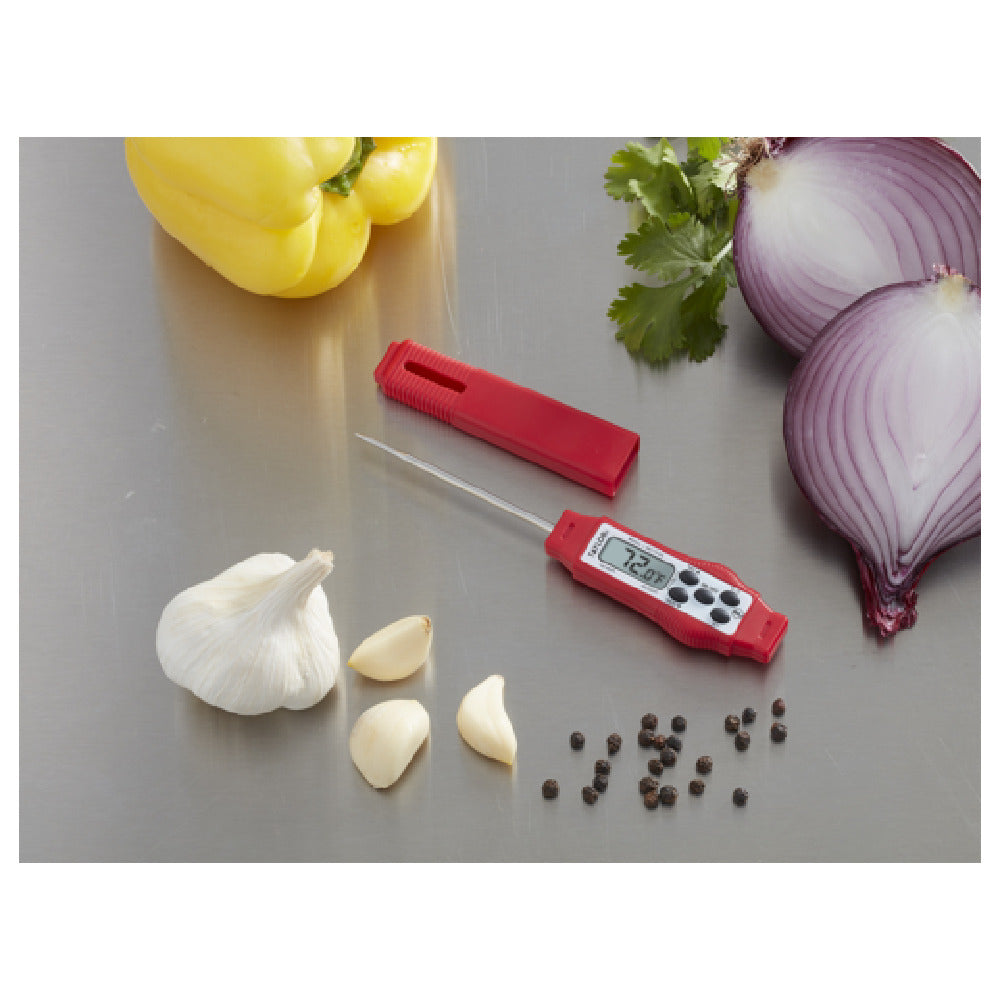 The Taylor 9877FDARD Digital Thermometer - Compact Waterproof is a precision instrument designed for professionals who demand accuracy and reliability in temperature measurement. This digital thermometer comes in a vibrant red color, adding a touch of visibility in busy environments. Its compact design makes it highly portable, fitting easily into pockets or small storage areas, enhancing convenience for on-the-go use. The waterproof feature ensures that the device withstands exposure to moisture and can be easily cleaned, making it ideal for use in culinary environments, laboratories, and other settings where hygiene and durability are paramount. With its digital readout, users can quickly and accurately determine temperatures, aiding in maintaining quality and safety standards across various applications, such as food preparation and scientific experiments. The Taylor 9877FDARD is a reliable tool for chefs, food safety inspectors, and laboratory technicians who require precise temperature readings. Its sturdy construction and ergonomic design make it a valuable addition to any professional toolkit. Notably, the product is offered in a case pack that cannot be broken, ensuring that enterprises receive a consistent, unbroken supply for their operational needs, thereby streamlining procurement and inventory processes.