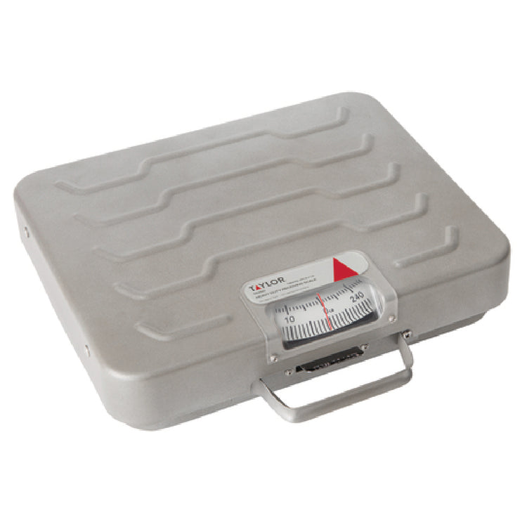 The Taylor TR250 Scale Receiving Dial Type is a precision instrument tailored for industries requiring accurate weight measurements. With a capacity of 250 lbs. x 1 lb., it adeptly caters to various sectors needing reliable scale operations. The platform measures 13-1/4" x 11" x 2", providing a stable base for weighing, while the scale dimensions of 12-3/4" x 12-1/4" x 3-1/4"H facilitate ease of use in different operational settings. The 1-3/4" x 4-3/4" handle is designed for ergonomics, contributing to user-friendly maneuverability. For enhanced functionality, the scale incorporates a press lock feature, ensuring consistent accuracy and reliability during measurements. Constructed with heavy-duty powder-coated metal, the Taylor TR250 scale stands out for its durability and robustness in demanding environments. This makes it a valuable tool across various market segments, from logistics to manufacturing, where precise weight measurement is pivotal. The design and build of the Taylor TR250 reflect its commitment to quality and precision, providing an effective solution for businesses that depend on accurate weight data.