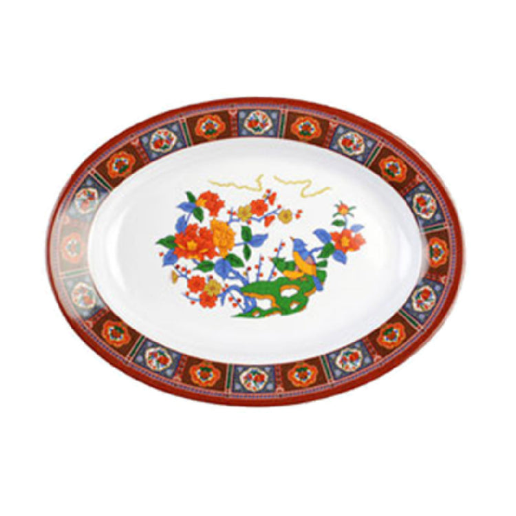The Thunder Group 2109TP Platter is a versatile 7 oz serving dish, measuring 9" x 6-3/4", designed for both functionality and durability. This oval-shaped platter is deep and break-resistant, making it a reliable choice for restaurants, cafeterias, and catering services that demand longevity and resilience in their serving ware. Constructed from high-quality melamine, this platter is dishwasher safe, ensuring ease of cleaning and maintenance, ideal for high-turnover food service environments. Its BPA-free composition guarantees safety for food contact, aligning with health-conscious dining standards. The platter's design features a Peacock pattern, adding an aesthetic appeal that enhances presentation, suitable for upscale dining experiences and casual settings alike. Certified by NSF, this platter meets strict public health and safety standards, making it a trusted option for professional use. The Thunder Group 2109TP Platter blends practicality with style, offering a break-resistant solution that remains lightweight and easy to handle, catering to both the hospitality industry and everyday household use.