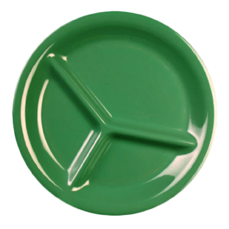 The Thunder Group CR710GR Compartment Plate 10-1/4" Dia. Round is an innovative dining solution catering to both food service professionals and everyday users seeking durability and practicality. Crafted from high-quality melamine, this compartment plate is notably break-resistant, ensuring longevity even under rigorous use, making it ideal for settings such as cafeterias, schools, and casual dining establishments. The plate features a diameter of 10-1/4 inches, providing ample space for food presentation. Its three distinct wells are designed for convenient portioning and serving, enhancing meal organization and presentation. With a soothing green hue, this plate adds a touch of color to table settings while being BPA-free, reflecting a commitment to user safety and environmental considerations. Certified by NSF, it meets stringent public health and safety standards, making it a reliable choice for professional kitchens. Additionally, its dishwasher-safe nature simplifies post-use cleanup, significantly reducing labor time and effort. The Thunder Group CR710GR Compartment Plate embodies a perfect blend of functionality and style, suited for varied market segments that prioritize both practicality and aesthetic appeal in food presentation.