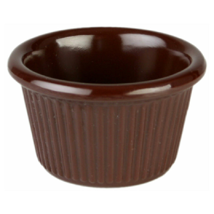 The Thunder Group ML507C1 Ramekin 1-1/2 Oz. Capacity 2-1/2" Dia. is an exceptional choice for both commercial kitchens and home use, offering a blend of aesthetic appeal and practical functionality. This round, fluted ramekin boasts a compact 1-1/2 oz. capacity, making it perfect for serving individual portions of condiments, desserts, or appetizers. Measuring 2-1/2 inches in diameter, it fits effortlessly into any table setting. Crafted from high-quality melamine, the ramekin ensures durability and break-resistance, ideal for high-traffic environments. Its chocolate hue adds a sophisticated touch to presentation, while being BPA-free guarantees safety in food service. Designed with convenience in mind, it is dishwasher safe, simplifying the cleaning process. Furthermore, the Thunder Group ML507C1 Ramekin is NSF certified, which underscores its adherence to strict public health standards, enhancing its appeal for professional culinary establishments. This versatile ramekin caters to various segments within the food industry, from fine dining restaurants to casual eateries, providing a reliable and stylish option for serving and presentation needs.