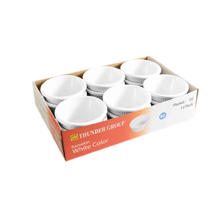 The Thunder Group ML507W1R Ramekin 1-1/2 Oz. Capacity 2-1/2" Dia. is an expertly designed serving solution tailored for culinary professionals and home cooks alike. This ramekin is crafted from high-quality melamine, ensuring durability and a break-resistant nature that makes it suitable for bustling kitchen environments. With a capacity of 1-1/2 ounces and a diameter of 2-1/2 inches, it is perfect for serving individual portions of condiments, dressings, or small desserts. The round, fluted design not only enhances its aesthetic appeal but also provides a classic look suitable for any table setting. Its BPA-free composition underscores a commitment to safety, making it an excellent choice for health-conscious establishments. The ramekin is dishwasher safe, offering ease of maintenance and ensuring it remains pristine even with frequent use. Certified by NSF, it meets rigorous public health standards, further augmenting its suitability for professional use. Available in a pristine white finish, this ramekin blends seamlessly with any décor, providing a versatile serving solution for a variety of settings, from restaurants to catering events. This retail pack includes 12 pieces, making it a cost-effective option for businesses seeking reliable and stylish serveware.