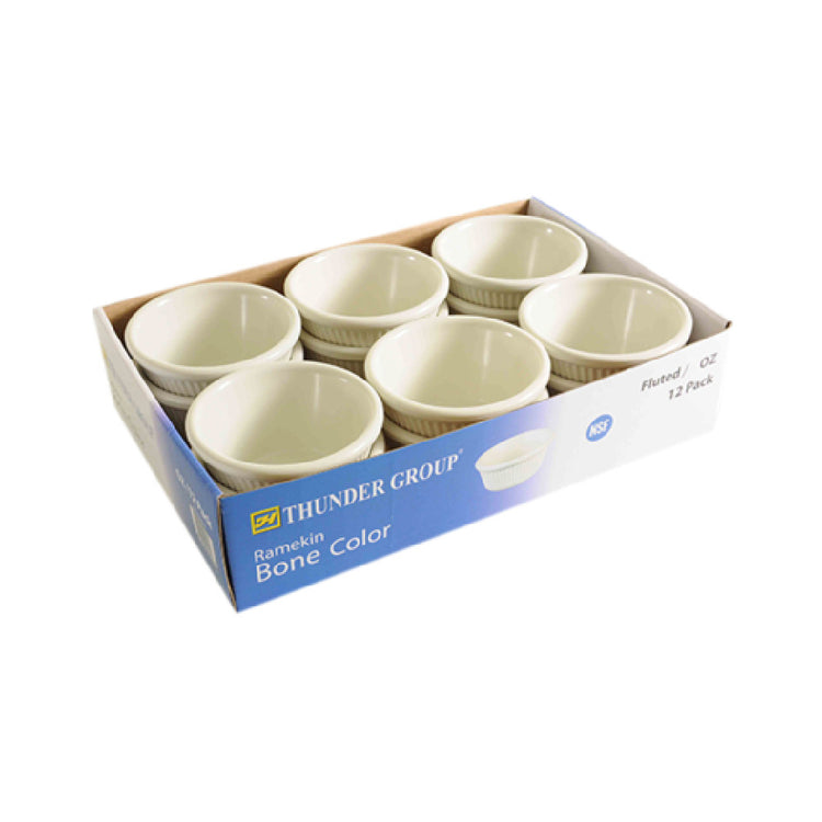 The Thunder Group ML531B1R Ramekin 3 oz. Capacity 3-1/8" Dia. is a versatile kitchen essential perfect for diverse culinary applications. This ramekin boasts a 3 oz. capacity and measures 3-1/8 inches in diameter, making it ideal for individual servings of sauces, condiments, or small desserts. Its round, fluted design not only adds a touch of elegance but also ensures a secure grip. Crafted from melamine, this ramekin is break-resistant, offering durability for long-term use in busy environments. The bone color provides a classic and sophisticated appearance, suitable for any table setting. As a BPA-free product, it ensures safety in food handling, while its dishwasher-safe feature allows for easy cleaning and maintenance. The Thunder Group ML531B1R Ramekin is NSF certified, meeting high public health and safety standards, making it a reliable choice for both professional chefs and home cooks. Available in retail packs of 12, this ramekin is an excellent choice for restaurants, catering services, or at-home use, offering consistent performance and exceptional durability in any culinary setting.