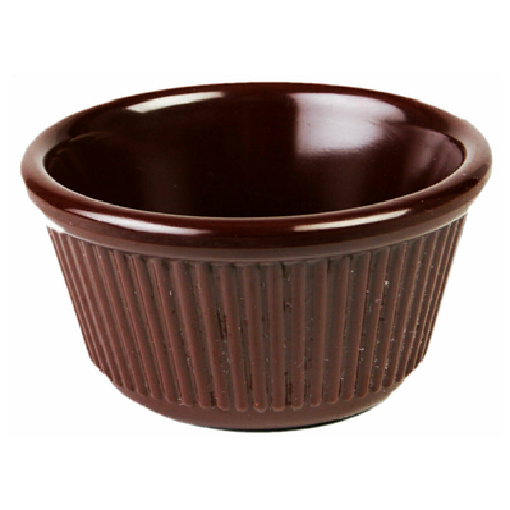 The Thunder Group ML532C1 Ramekin 4 Oz. Capacity 3-3/8" Dia. is a round, fluted melamine ramekin, crafted to combine functionality and durability in any culinary setting. With a 4 oz. capacity and a 3-3/8" diameter, it offers the ideal dimensions for serving individual portions of sauces, dressings, or desserts with a touch of elegance. Distinguished by its chocolate hue, this ramekin adds a sophisticated aesthetic to any table or food presentation. Engineered with break-resistant properties, it ensures longevity and reliability even in high-traffic environments. The material is BPA free, reflecting a commitment to safety and health standards. Additionally, the ramekin is dishwasher safe, allowing for convenient cleaning and maintenance, which is crucial for busy food service operations. Certified by NSF, it meets rigorous public health standards, solidifying its suitability for professional kitchens. The Thunder Group ML532C1 is a versatile choice for restaurants, cafes, and catering services, where quality and presentation are paramount. Its durable construction and practical design make it a valuable addition to any food service establishment, providing exceptional utility without compromising on style.