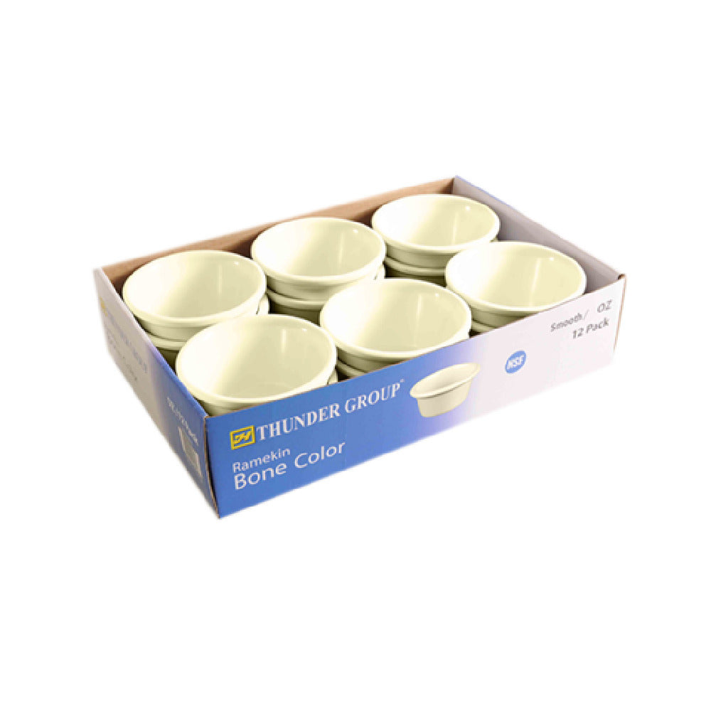 The Thunder Group ML537B1R Ramekin - 3 Oz. Capacity 3-1/8" Dia. is a versatile and durable dish perfect for a variety of settings, including restaurants, catering companies, and home kitchens. With a precise capacity of 3 ounces and a diameter of 3-1/8 inches, this round ramekin is designed to meet the exacting standards of culinary professionals. Constructed from high-quality melamine, the ramekin is both break-resistant and BPA-free, ensuring safety and longevity in demanding kitchen environments. The smooth finish not only enhances its aesthetic appeal but also makes it easy to clean, with the added convenience of being dishwasher safe. Certified by NSF, this ramekin meets stringent public health and safety standards, making it a reliable choice for food service establishments. The bone-colored design seamlessly integrates into diverse table settings, offering a classic look that complements a wide range of culinary presentations. Packaged in retail packs containing 12 pieces each, this ramekin is ideal for bulk purchases by large-scale operations and individual buyers alike. Its functional design and durable construction make the Thunder Group ML537B1R Ramekin an essential piece of serveware for any professional or home kitchen seeking quality and reliability.