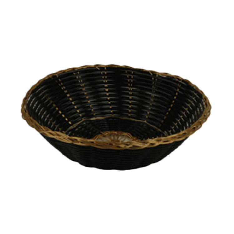 The Thunder Group PLBB825G Basket 8" x 8" x 2-1/4" Round is a meticulously crafted, versatile storage solution designed to meet the diverse needs of the foodservice industry. With dimensions of 8 inches in diameter and a height of 2-1/4 inches, this round basket is ideal for efficiently organizing and presenting various food items. Constructed from break-resistant plastic, it ensures durability and longevity, even in high-traffic commercial environments. The woven design adds an aesthetic appeal, making it suitable for both back-of-house and front-of-house applications. A striking black finish with gold trim embellishes the basket, enhancing its visual appeal while maintaining a professional look. One of its standout features is its stackability, which optimizes storage space and simplifies inventory management in busy kitchens. The Thunder Group PLBB825G is available with a minimum order of 12 units, catering to large-scale operations that require bulk purchasing. This basket's robust construction and elegant design make it an excellent choice for restaurants, catering services, and hospitality businesses seeking a reliable and stylish serving accessory. Its practical design and durability ensure it can withstand the rigors of daily use while maintaining its pristine appearance.