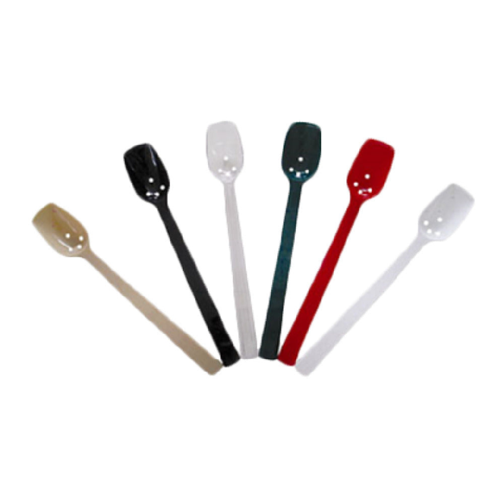 The Thunder Group PLBS110BK Buffet Spoon 10" 3/4 Oz. is an expertly designed utensil crafted to meet the demands of high-volume food service environments, such as catering events, buffets, and restaurant kitchens. This buffet spoon, measuring 10 inches in length, is tailored to provide a comfortable grip and efficient serving experience. With a capacity of 3/4 oz., it is ideal for portion-controlled serving, ensuring precision and consistency. The spoon is perforated, allowing excess liquid to drain, making it particularly suitable for serving items that are lightly sauced or cooked in liquid. Constructed from durable black polycarbonate, this spoon is resilient to the rigors of constant use, while its dishwasher-safe design simplifies cleaning and maintenance. The black color adds a sleek, professional appearance, integrating seamlessly with a variety of table settings and buffet spreads. Additionally, its NSF certification guarantees that it meets strict public health standards, making it a reliable choice for commercial food service operations seeking utensils that combine functionality, durability, and compliance. The Thunder Group PLBS110BK Buffet Spoon is a valuable asset for diverse food service markets, catering to professional chefs and caterers who prioritize both performance and aesthetic appeal in their culinary tools.