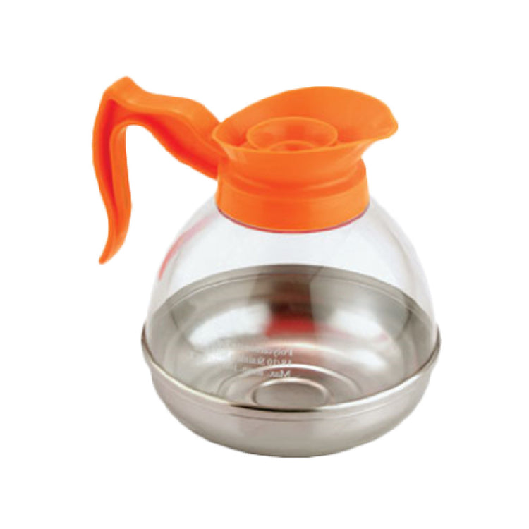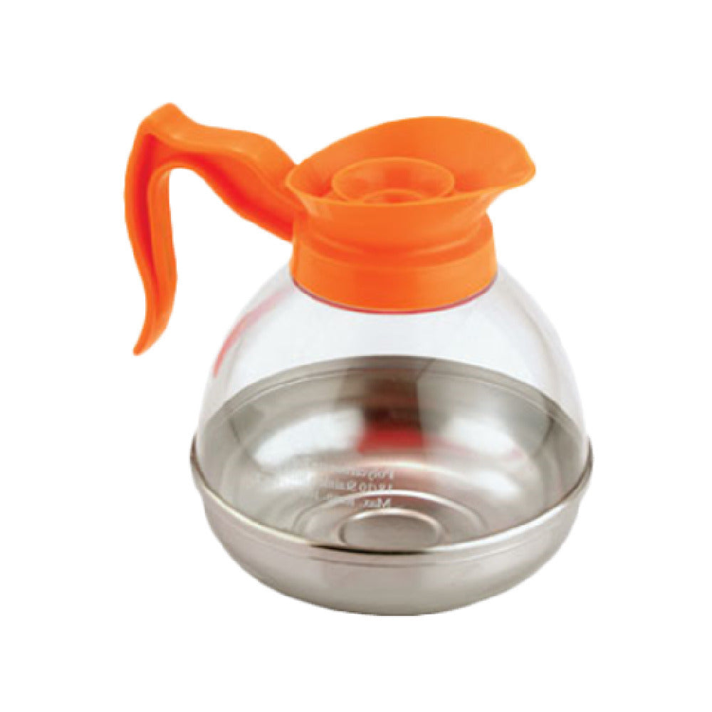 The Thunder Group PLCD064D Coffee Decanter is a robust and reliable option for establishments that prioritize durability and efficiency in their beverage service. With a substantial 64 oz. capacity, this decanter is well-suited for high-volume environments such as busy cafes, restaurants, and office break rooms. It is designed with a durable plastic handle and top, ensuring ease of use and safety during pouring. The break-resistant polycarbonate body enhances its longevity, making it a cost-effective solution for long-term use. The stainless steel base adds a layer of resilience and stability, while the orange color indicates that it is specifically intended for decaf coffee, aiding in the easy identification and differentiation from regular coffee decanters. The Thunder Group PLCD064D is ideal for diverse market segments within the food and beverage industry, offering a combination of durability, practicality, and clear functionality. Whether utilized in a bustling restaurant or a corporate setting, this coffee decanter stands as a testament to innovative design that meets the rigorous demands of professional environments while maintaining an attractive and functional appearance.