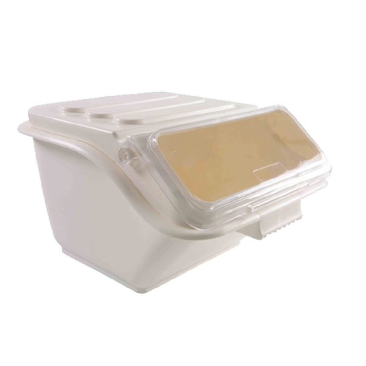 The Thunder Group PLIB010S Shelf Ingredient Bin is a practical storage solution with a capacious design, making it suitable for diverse culinary environments. With a 10-gallon (150-cup) capacity, this bin measures 19-1/4 inches by 23-3/8 inches by 17 inches, providing ample space for storing a variety of ingredients. The stackable nature of the bin facilitates efficient use of vertical space, ideal for bustling kitchens with limited storage. It features a clear flip-top lid that allows for easy visibility of contents, ensuring quick access and inventory management. The inclusion of a scoop with a built-in holder enhances convenience, enabling efficient portioning without the need for additional tools. Constructed from durable polypropylene, the bin is dishwasher safe, simplifying cleaning procedures and maintaining hygiene standards. The white color lends a clean, professional appearance, while its NSF certification assures compliance with health and safety regulations. The Thunder Group PLIB010S is designed with the professional kitchen in mind, offering a blend of functionality and efficiency suited to commercial food service operations, restaurants, and catering services seeking reliable ingredient storage solutions.