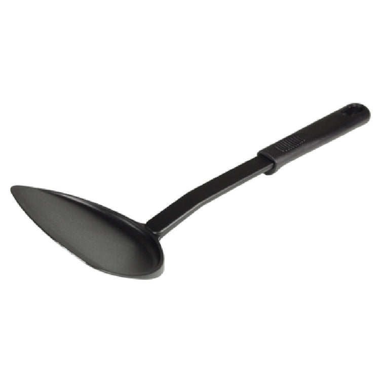 The Thunder Group PLPP011BK Turner is a reliable kitchen tool designed with a 7-1/2" x 4" blade and an overall length of 12". Engineered for durability, this turner is crafted from solid nylon, which is not only robust but also heat-resistant up to 410°F, ensuring performance under high-temperature conditions. Its sleek black finish offers a professional aesthetic suitable for both commercial kitchens and home use. The turner's substantial blade size allows for easy handling of a variety of food items, making it a versatile choice for chefs and cooking enthusiasts alike. In professional settings, such as restaurants and catering services, this turner aids in efficient food preparation and presentation. Additionally, the minimum order requirement of 12 units makes it a practical choice for bulk purchases, catering to businesses looking to equip their kitchens with high-quality utensils. With its precise engineering and attention to detail, the Thunder Group PLPP011BK Turner stands out as a valuable asset for anyone seeking a reliable, heat-resistant kitchen tool designed to meet the rigorous demands of the culinary industry.
