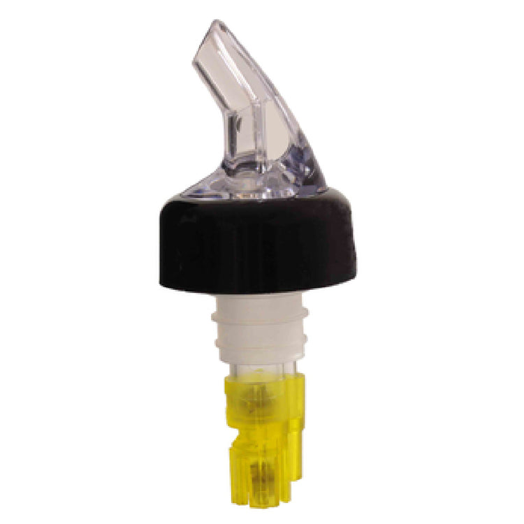 The Thunder Group PLPR150C Liquor Pourer 1-1/2 Oz. With Black Collar is a precision-engineered accessory tailored for bartenders and beverage professionals seeking accurate and consistent pours. This liquor pourer features a 1-1/2 oz. capacity, ensuring precise portion control for crafting cocktails and managing inventory efficiently. It is designed to fit standard 750ml bottles, making it a versatile tool compatible with most liquor bottles used in the industry. Constructed from SAN plastic, the pourer is both durable and lightweight, promising longevity and ease of use in high-volume settings. The clear spout offers visibility, allowing for accurate monitoring of flow, while the yellow tail adds a distinctive visual cue for easy identification and categorization. The black collar not only enhances the aesthetic appeal but also provides a secure fit, preventing leaks and spills. Each pack contains 12 pourers, which is ideal for busy bars, restaurants, or event catering services requiring multiple stations. This pourer is an essential tool for those in the hospitality sector, where precision, efficiency, and durability are paramount to service excellence and customer satisfaction. The Thunder Group PLPR150C is a reliable choice for enhancing the accuracy and speed of beverage preparation.