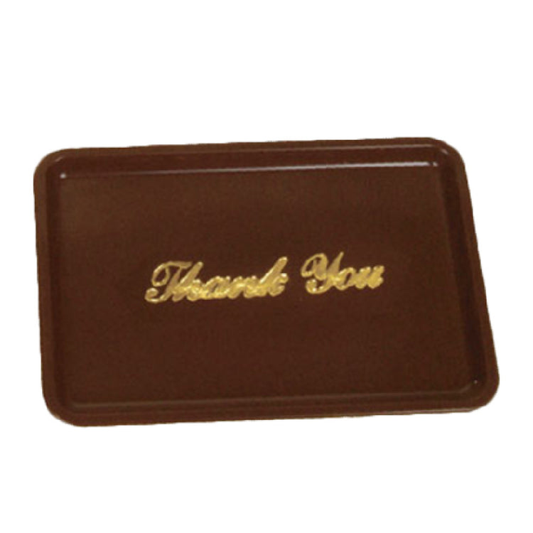 The Thunder Group PLPT046BR Tip Tray 4-1/2" X 6-1/2" Rectangular combines practicality with durability, making it an essential asset for any dining establishment. Crafted from sturdy plastic, this brown tip tray is designed for consistent use in high-traffic environments, such as restaurants, cafes, or diners. Its dimensions of 4-1/2 inches by 6-1/2 inches provide ample space for receipts and payment processing, facilitating smooth and efficient service flow. The tray is imprinted with a courteous "Thank You" message, adding a touch of professionalism and appreciation to customer interactions. This product requires a minimum order of four dozen, ideal for establishments needing a consistent supply of service essentials. The rectangular shape is not only aesthetically pleasing but also functional, allowing for easy stacking and storage, thus maximizing space efficiency in service areas. The Thunder Group PLPT046BR Tip Tray is a reliable choice for foodservice professionals seeking a durable and functional solution to enhance their customer service experience.