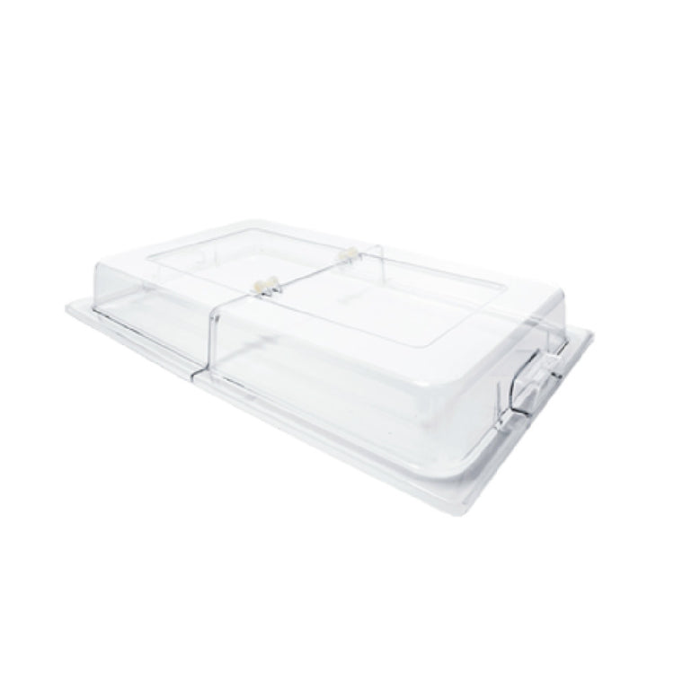 The Thunder Group PLRCF001H Chafer Dome Cover - Rectangular, Hinged is a premium product specifically designed for the hospitality industry, serving as an essential accessory for full-size 8 qt. chafers. This durable cover is meticulously crafted from high-quality polycarbonate material, providing a clear view of the food while ensuring robust protection against contaminants. The rectangular design of the dome cover is complemented by a hinged mechanism, allowing for easy access and serving, which is particularly beneficial for buffet settings and catering services. Additionally, it is equipped with dual-sided handles, which enhance usability and convenience during food service operations. With a minimum order quantity of 12, this chafer dome cover is ideal for businesses requiring bulk purchase, such as hotels, event venues, and large-scale food service providers. Its clear construction not only offers a sleek and modern appearance but also aids in maintaining the presentation quality of the dishes. This product stands out by combining functionality with durability, making it a reliable choice for professionals seeking to enhance their food service equipment with a product that adheres to high standards of quality and performance.