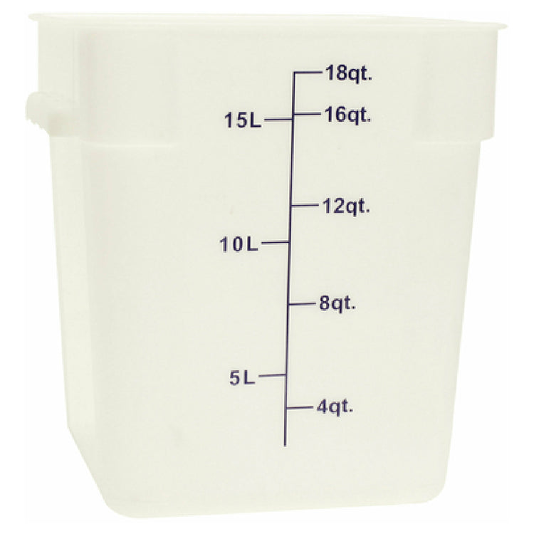 The Thunder Group PLSFT018PP Food Storage Container is an 18-quart capacity square container designed to meet diverse storage needs in the food industry. With its robust construction from polypropylene, this container is both scratch and break-resistant, ensuring longevity and durability in demanding environments. It is engineered to withstand a wide temperature range from -40°F to 210°F, making it suitable for a variety of applications, including refrigeration and freezer storage, as well as ambient and hot food holding. The container's white color facilitates easy labeling and visual identification, enhancing organizational efficiency in professional kitchens. Meeting NSF standards, this container underscores its commitment to safety and quality, making it a reliable choice for foodservice professionals. The Thunder Group PLSFT018PP is particularly beneficial for restaurants, catering services, and institutional kitchens that require efficient storage solutions for bulk ingredients or prepared foods. Its square shape optimizes space utilization, allowing for more compact and orderly storage. The minimum order requirement of six units makes it ideal for businesses needing to outfit larger storage areas. This container's practical design and superior material quality deliver significant value, addressing the core needs of durability, safety, and temperature versatility in food storage solutions.
