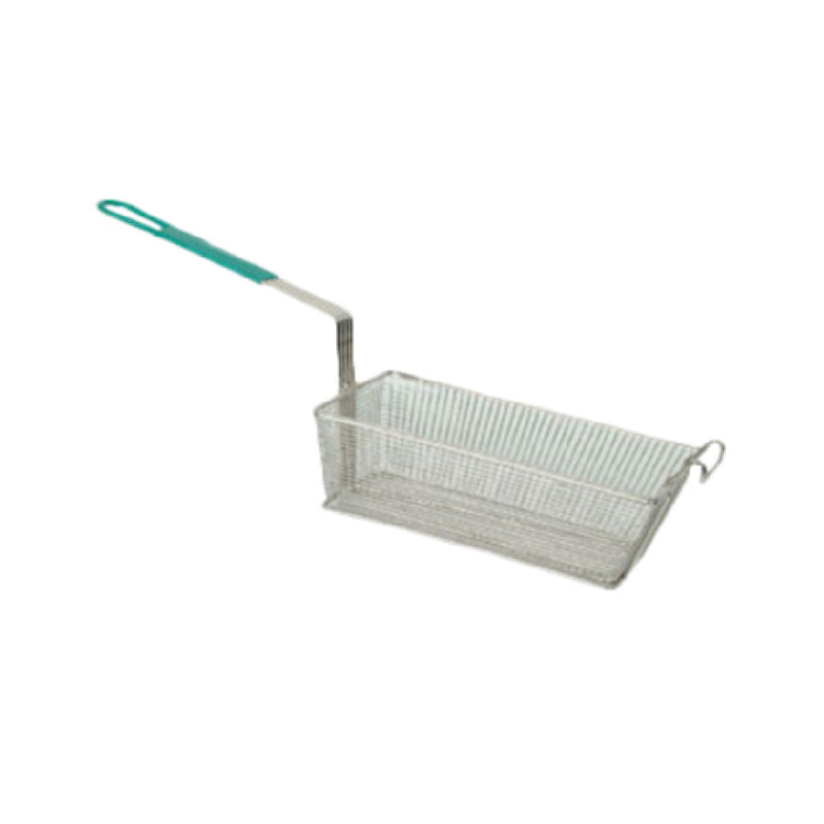 The Thunder Group SLFB004 Fry Basket is a rectangular wire mesh basket measuring 13 inches by 6-5/8 inches by 5-1/8 inches, crafted for robust and versatile use in various culinary settings. Its design features a convenient front hook, allowing it to easily rest on the edges of fryers for efficient draining. The basket's wire mesh construction ensures optimal oil flow and thorough frying while maintaining durability. Additionally, the fry basket is nickel-plated, providing enhanced corrosion resistance and longevity, making it a reliable choice for both commercial and home kitchens. The green handle not only offers a comfortable grip but also aids in identifying the basket among other kitchen tools, promoting safety and efficiency. This fry basket is an essential tool for restaurants, catering businesses, and food service operations, designed to meet the rigorous demands of high-volume frying. Its thoughtful construction and practical features make it an indispensable addition to any kitchen requiring consistent and high-quality frying results.