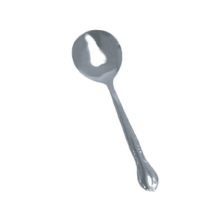 The Thunder Group SLSF113 Bouillon Spoon is a meticulously crafted utensil, measuring 6.1 inches in length and constructed from high-quality 18/0 stainless steel. This spoon is designed for durability and resistance to rust and corrosion, making it an excellent choice for both home kitchens and professional dining establishments. The bright finish adds a touch of elegance to its appearance, enhancing the dining experience with its aesthetic appeal. Part of the "Sunflower" line, this bouillon spoon is not only functional but also stylistically pleasing, fitting seamlessly into various table settings. Ideal for serving broths, soups, and stews, its ergonomic design ensures comfort in handling and ease of use. The 18/0 stainless steel composition means it has 18% chromium and 0% nickel, offering economic value while maintaining a shiny, polished look. This product is particularly appealing to restaurants and caterers seeking affordable, reliable flatware that combines function with style. Its precise dimensions make it versatile for various culinary applications, ensuring it meets the diverse needs of different market segments within the food service industry. The Thunder Group SLSF113 Bouillon Spoon is a practical addition to any cutlery collection, promising lasting performance and style.