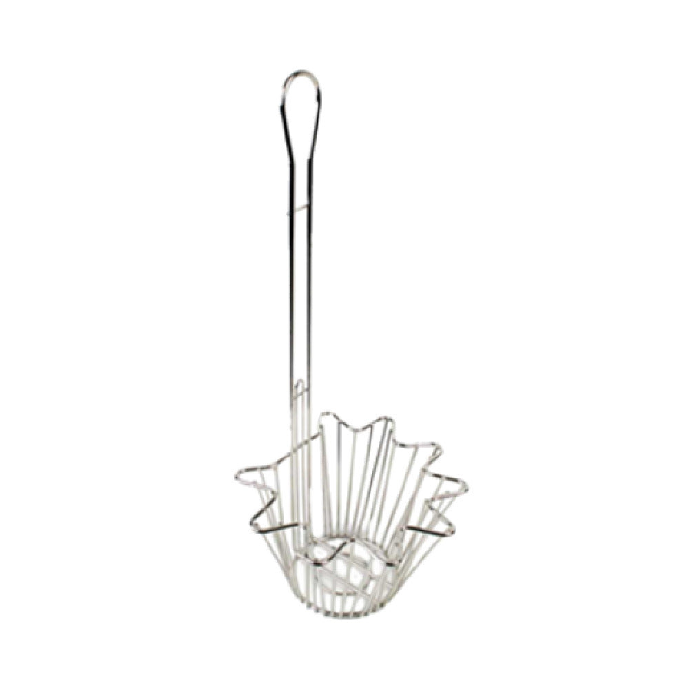 The Thunder Group SLTB018R Taco Salad Bowl Basket is a versatile kitchen tool measuring 8 inches by 8 inches with a depth of 5 inches, and an overall height of 18 inches. This round bowl basket is nickel-plated, which ensures durability and resistance to corrosion, making it ideal for professional kitchens and catering services. Its design is particularly suited for creating perfectly shaped taco salad bowls, providing a unique presentation option for restaurants and food service establishments looking to elevate their culinary offerings. The basket's round shape and precise dimensions allow for consistent preparation of salad bowls, enhancing efficiency in high-volume environments. This product is valuable for chefs and caterers who prioritize both functionality and presentation in their dishes. By helping create attractive and uniformly shaped taco salads, the Thunder Group SLTB018R enhances the dining experience, making it a must-have tool for establishments aiming to impress their clients with visually appealing and delicious meals. Its sturdy nickel-plated construction ensures it withstands frequent use, providing long-lasting reliability and performance in busy kitchens. This taco salad bowl basket is specifically designed for use in professional settings, offering consistent results that meet the high standards of the food service industry.