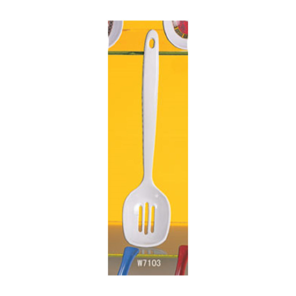 The Thunder Group W7103 Serving Spoon is a versatile kitchen utensil measuring 12 inches in length, designed to meet the demands of both professional chefs and home cooks alike. Crafted from durable melamine, this spoon offers exceptional break resistance, ensuring longevity and reliability in high-traffic kitchen environments. The slotted design of the spoon facilitates efficient draining of excess liquids from foods, making it an ideal tool for serving dishes such as pasta, vegetables, and salads. This serving spoon is dishwasher safe, providing convenient and hassle-free cleaning after use. Additionally, it features a hanging hole for easy storage, allowing for efficient organization in bustling kitchen spaces. Available in a classic white color, the Thunder Group W7103 Serving Spoon seamlessly integrates into various kitchen aesthetics. With a minimum order quantity of two dozen, it is particularly suited for catering businesses, restaurants, and other large-scale food service operations that require consistent quality and performance. This serving spoon embodies a blend of durability, practicality, and design, making it a valuable asset for any culinary professional seeking reliable serving tools. Its well-considered features ensure it stands out as an essential component of efficient kitchen operations.