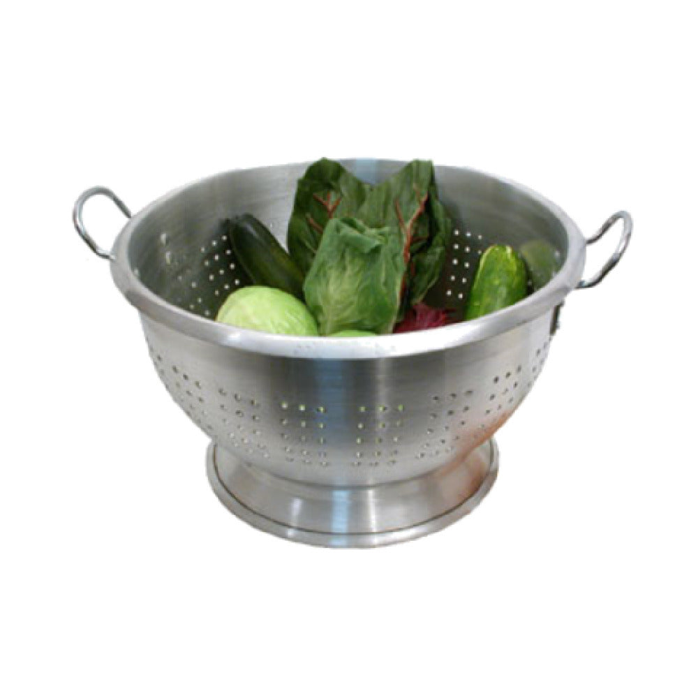 The Town 37324/DZ Colander is a high-capacity kitchen tool, boasting a 24-quart capacity ideal for handling large volumes of food, making it a versatile choice for commercial kitchens, catering services, and food processing facilities. Constructed from heavy-duty aluminum, this colander ensures durability and long-lasting performance in demanding environments. The aluminum material is known for its lightweight properties while offering excellent resistance to corrosion, which is essential for maintaining hygiene standards in food service operations. It features large riveted handles, providing a secure and comfortable grip for easy maneuvering, even when filled to capacity. The footed base is designed to elevate the colander, allowing for efficient drainage of excess liquid and ensuring the contents remain elevated from any surface. Sold in a dozen pack, the Town 37324/DZ Colander addresses the needs of large-scale food preparation and serving establishments, offering a reliable solution for those requiring multiple units. Its robust design and practical features make it an indispensable tool in any professional kitchen setting, where efficiency and reliability are paramount. This colander's unique combination of size, material, and design features positions it as a valuable asset for professionals in the culinary industry.