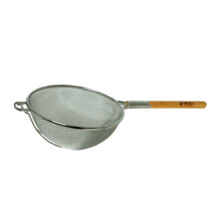 The Town 42414S Strainer - 14" Dia. Bowl Double Mesh is an expertly designed kitchen tool that caters to diverse culinary needs across various industry segments. This strainer features a 14-inch diameter bowl, making it ideal for handling large quantities of ingredients efficiently. The double mesh design incorporates both coarse and fine meshes, providing versatility in straining tasks, whether it's to achieve a fine puree or to separate larger food particles. The strainer is constructed from 18/8 stainless steel, known for its durability and resistance to corrosion, ensuring long-lasting performance in demanding kitchen environments. Complementing the robust bowl is a 17-1/2" lacquered wood handle, offering a comfortable grip and extended reach, which is particularly beneficial in commercial settings where safety and ease of use are paramount. The combination of high-quality materials and thoughtful design makes the Town 42414S Strainer an indispensable tool for chefs and culinary professionals who require reliability and precision in their kitchen operations. Whether in a high-paced restaurant or a bustling food processing facility, this strainer stands out as a vital component in the culinary toolkit, promising efficiency and excellence in every use.