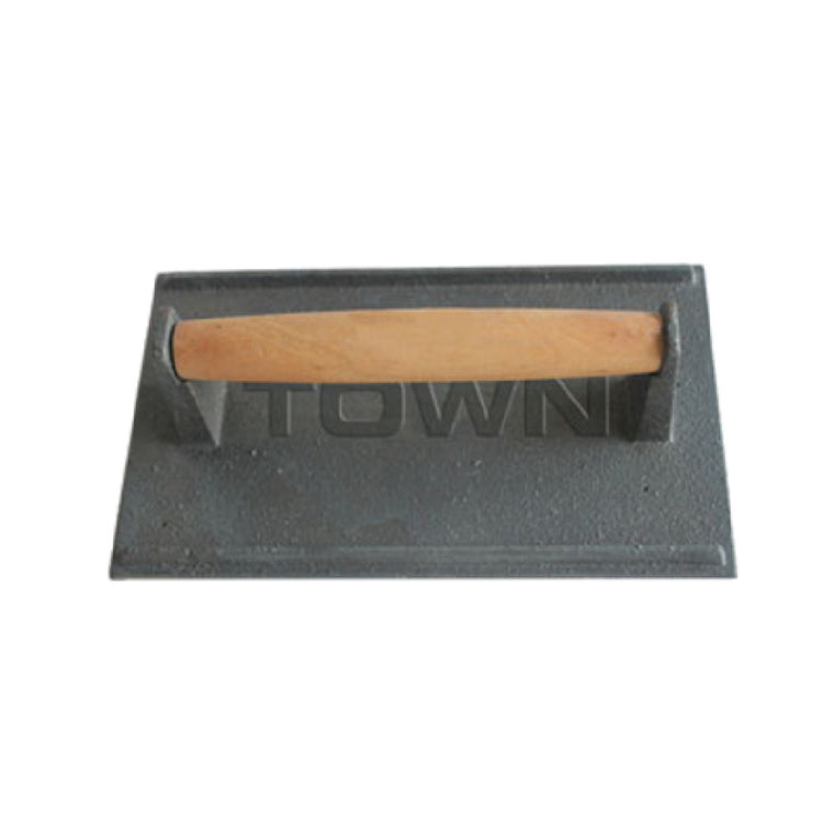 The Town 48690 Grill Press is a precision-crafted culinary tool, measuring 9-1/2" x 5-4/5" x 2-3/4", designed to enhance cooking efficiency and quality in both professional and home kitchens. Constructed from robust cast iron, this grill press is engineered for durability and superior heat retention, ensuring even cooking results across a variety of foods. Its substantial weight helps to press meats and vegetables firmly onto the grill or griddle surface, promoting faster cooking times and creating coveted grill marks. This makes it an indispensable tool for restaurants specializing in grilled sandwiches and burgers, as well as for catering services that require consistent, high-quality results in high-volume cooking environments. In the home kitchen, the Town 48690 Grill Press offers amateur chefs the opportunity to achieve professional-grill results with ease. Its compact size is ideal for easy storage and maneuverability, making it a versatile addition to any kitchen arsenal. Whether employed in a bustling restaurant or a cozy home setting, the Town 48690 Grill Press stands as a testament to functional design and reliable performance, representing significant value across diverse culinary applications.