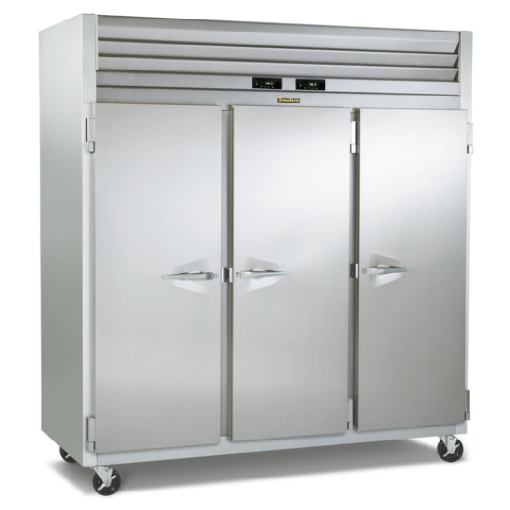 The Traulsen ADT332NUT-HHS Spec-Line Refrigerator-Freezer Dual Temp Cabinet is a highly advanced reach-in appliance, engineered for optimal performance in commercial settings. This three-section unit, with its self-contained refrigeration system, is crafted with a stainless steel exterior, ensuring durability and a professional look, while the aluminum interior provides an efficient and easy-to-clean storage environment. Its standard depth design features six lockable narrow half-height doors, each equipped with EZ-Clean gaskets to ensure airtight sealing and simple maintenance. Inside, the unit houses three adjustable wire shelves per section, providing customizable storage solutions for various refrigeration and freezing needs. The interior LED lighting enhances visibility, ensuring that stored items are easily accessible. The unit is operated with advanced microprocessor controls that offer precision in temperature management. With dual 1/2 HP refrigeration units, the Traulsen ADT332NUT-HHS is both cETLus and ETL-Sanitation certified, affirming its adherence to North American safety and sanitation standards. This dual-temp cabinet is an ideal solution for restaurants, catering businesses, and other food service operations requiring reliable and versatile refrigeration and freezing capabilities within a single appliance.