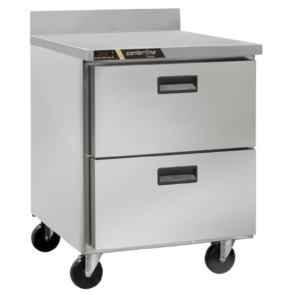Traulsen CLUC-27R-DW-WT Centerline™ Compact Undercounter Refrigerator With Work Top is a versatile refrigeration solution, ideal for a variety of commercial settings such as restaurants, cafes, and food service operations that require compact and efficient refrigeration. This unit measures 27 inches in width, boasting a 6.5 cubic foot capacity, making it a space-efficient choice for businesses that need to maximize their kitchen area. Its self-contained rear-mount refrigeration system ensures efficient cooling, utilizing R450A refrigerant with a 1/4 horsepower motor. The refrigerator features two drawers, facilitating organized storage and easy access to ingredients. The electronic control with LED display provides precise temperature management. Constructed with a stainless steel exterior and an anodized aluminum interior, this refrigerator is designed for durability and easy cleaning. The inclusion of a 4-inch backsplash adds practicality and helps maintain cleanliness. Mounted on four casters, it offers mobility and flexibility in kitchen layouts. Operating on 115 volts, 60 Hz, and single-phase power, the unit requires a 3.3 amp draw and is fitted with a NEMA 5-15P plug. Certified by cETLus and ETL-Sanitation, the Traulsen CLUC-27R-DW-WT ensures compliance with safety and sanitation standards, making it a reliable and valuable addition to any food service operation.