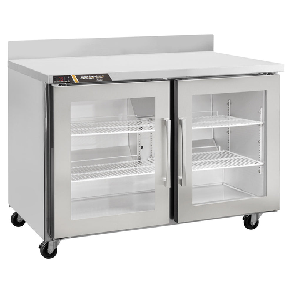 The Traulsen CLUC-48R-GD-WTLL Centerline™ Compact Undercounter Refrigerator With Work Top is a highly efficient refrigeration solution designed for professional kitchens requiring versatile storage options and a durable workspace. This compact unit offers a 48-inch width and a 13.28 cubic feet capacity, making it suitable for various commercial environments. It features a self-contained rear-mount refrigeration system, ensuring reliable performance and ease of maintenance. The refrigerator is equipped with two left-hinged glass doors that are field reversible, allowing flexibility in door configuration to suit different kitchen layouts. An electronic control system with an LED display provides precise temperature management. Inside, each section includes two epoxy-coated shelves, maximizing storage organization. The exterior is constructed from stainless steel, while the interior is made of anodized aluminum, offering a balance of durability and ease of cleaning. A 4-inch backsplash and four casters enhance its practicality and mobility within the workspace. The unit uses R450A refrigerant and operates with a 1/4 HP motor at 115 volts, 60 hertz, and a single phase, drawing 3.6 amps via a NEMA 5-15P plug. Certified by cETLus and ETL-Sanitation and recognized by ENERGY STAR®, this refrigerator is an energy-efficient and compliant choice for busy commercial settings.