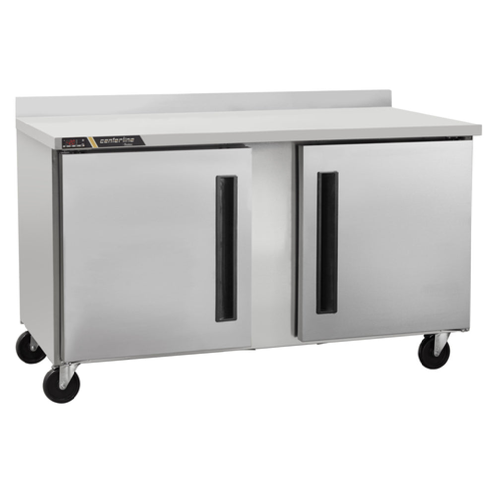 The Traulsen CLUC-60R-SD-WTLR Centerline™ Compact Undercounter Refrigerator with Work Top is a versatile and efficient refrigeration solution designed to meet the needs of various segments in the food service industry. This two-section refrigerator measures 60 inches in width and provides a substantial 16.94 cubic feet of storage capacity, making it suitable for kitchens with limited space but high demand for reliable refrigeration. The self-contained rear-mount refrigeration system is powered by a 1/4 horsepower motor, operating on 115 volts with a single-phase connection and drawing 3.6 amps. The unit features one left-hinged and one right-hinged solid door, both of which are field reversible, enhancing its adaptability to different kitchen layouts. Equipped with an electronic control panel with an LED display, it ensures precise temperature management. Inside, each section includes two epoxy-coated shelves to organize storage effectively. The stainless steel exterior and anodized aluminum interior ensure durability and ease of cleaning, while the 4-inch backsplash provides added protection against spills. Mobility is facilitated by four casters, and the refrigerator uses R450A refrigerant, aligning with environmental standards. Certified by cETLus and ETL-Sanitation and awarded the ENERGY STAR®, this model underscores a commitment to energy efficiency and safety compliance.