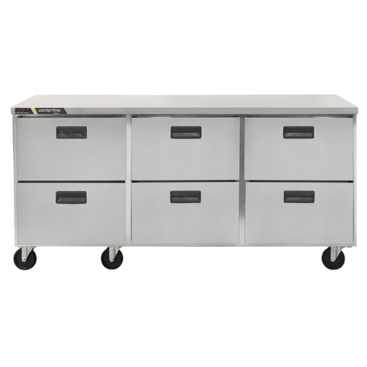 The Traulsen CLUC-72R-DW Centerline™ Compact Undercounter Refrigerator is a versatile and efficient refrigeration unit designed for commercial kitchens with space constraints. This three-section refrigerator measures 72 inches wide and boasts a substantial 18.80 cubic feet capacity, making it perfect for various culinary environments requiring compact yet spacious storage solutions. The self-contained rear-mount refrigeration system ensures efficient cooling, utilizing R450A refrigerant for environmentally conscious operation. Equipped with six drawers, this unit provides flexible storage options, while the electronic control with LED display enables precise temperature management. The exterior is constructed from durable stainless steel, ensuring longevity and ease of maintenance, while the anodized aluminum interior offers a clean, corrosion-resistant environment for stored items. The unit is mounted on six casters, facilitating easy mobility within a bustling kitchen. With a 1/4 horsepower motor, operating on 115 volts at 3.6 amps, and fitted with a NEMA 5-15P plug, it is both powerful and convenient. Certified by cETLus and ETL-Sanitation, and awarded the ENERGY STAR® rating, this refrigerator exemplifies compliance with industry standards for safety, sanitation, and energy efficiency, making it an ideal choice for diverse market segments within the foodservice industry.