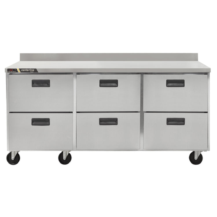 The Traulsen CLUC-72R-DW-WT Centerline⢠Compact Undercounter Refrigerator With Work Top is a versatile refrigeration unit designed for efficiency and functionality in diverse professional environments. With a spacious 18.80 cu. ft. capacity spread across three sections, it caters to various storage needs. The unit features self-contained rear-mount refrigeration, utilizing R450A refrigerant and a 1/4 HP motor, ensuring reliable temperature management. Its electronic control with an LED display allows precise temperature adjustments, enhancing performance. The refrigerator's robust stainless steel exterior and anodized aluminum interior provide durability and ease of cleaning, maintaining high hygiene standards. Six drawers offer organized storage solutions, suitable for different food service setups. Additionally, this refrigerator includes a 4" backsplash for added workspace functionality. Its mobility is supported by six casters, making it adaptable to changing kitchen layouts. Operating at 115v/60/1-ph with a 3.6-amp draw and equipped with a NEMA 5-15P plug, it is energy-efficient, evidenced by its ENERGY STARĆĀ® certification. The Traulsen CLUC-72R-DW-WT is cETLus and ETL-Sanitation certified, making it an ideal choice for businesses that prioritize quality and compliance with industry standards. This compact undercounter refrigerator is designed to meet the rigorous demands of culinary professionals.