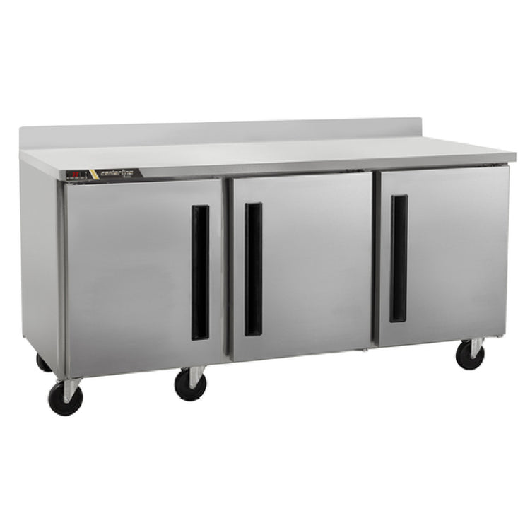 The Traulsen CLUC-72R-SD-WTLLL Centerline™ Compact Undercounter Refrigerator With Work Top is a meticulously designed refrigeration unit tailored to meet the demands of various industry markets. This three-section refrigerator boasts a width of 72 inches and offers a generous 18.80 cubic feet of storage capacity, making it suitable for both small and large-scale operations. The self-contained rear-mount refrigeration system, utilizing R450A refrigerant and a 1/4 HP motor, ensures efficient cooling, supported by an electronic control with LED display for precise temperature management. The unit features three left-hinged solid doors, which are field reversible, catering to customizable access needs. Each section is equipped with two epoxy-coated shelves, providing robust and versatile storage solutions. A 4-inch backsplash complements the stainless steel exterior and anodized aluminum interior, enhancing durability and hygiene. Mobility is ensured with six casters, facilitating easy repositioning as needed. The refrigerator operates on 115v/60/1-ph and draws 3.6 amps, requiring a NEMA 5-15P outlet. Certified by cETLus and ETL-Sanitation, and awarded an ENERGY STAR® rating, the Traulsen CLUC-72R-SD-WTLLL is an exemplary choice for those seeking a reliable, energy-efficient refrigeration solution.