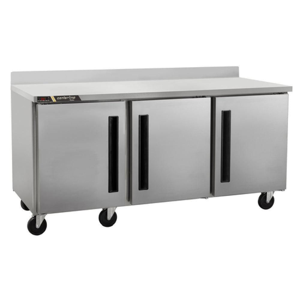 The Traulsen CLUC-72R-SD-WTLRR Centerline™ Compact Undercounter Refrigerator With Work Top is a highly efficient refrigeration solution tailored for diverse commercial environments. Engineered with a three-section design, it spans 72 inches in width, offering a generous 18.80 cubic feet capacity. This model features self-contained rear-mount refrigeration, utilizing R450A refrigerant, powered by a 1/4 HP motor. Operating at 115v/60/1-ph and drawing 3.6 amps, it supports energy-efficient operation and is ENERGY STAR® certified. The refrigerator is equipped with one left-hinged and two right-hinged solid doors, which are field reversible, providing flexibility for different kitchen layouts. The electronic control with LED display ensures precise temperature management, while the stainless steel exterior and anodized aluminum interior enhance durability and hygiene. Each section includes two epoxy-coated shelves, optimizing storage organization. A 4-inch backsplash is integrated into the design, and the unit is mounted on six casters, facilitating easy mobility and installation. The Traulsen CLUC-72R-SD-WTLRR is cETLus and ETL-Sanitation certified, making it a reliable choice for eateries, cafes, and other food service establishments that require a compact, yet robust refrigeration unit with added workspace functionality.