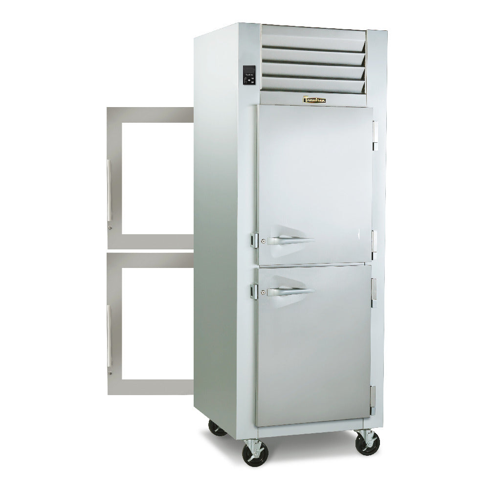 The Traulsen G16004P Dealer's Choice Refrigerator Pass-thru One-section 25.9 Cu. Ft. is a versatile refrigeration unit designed for efficiency and functionality in various commercial settings. This refrigerator features a one-section, pass-thru configuration with a total capacity of 25.9 cubic feet. It offers a unique door arrangement with two half-height solid doors on the control side and two half-height glass doors on the opposite side, all hinged to the left, allowing for easy access and visibility. The unit is equipped with three epoxy-coated shelves, providing durable and adjustable storage solutions for diverse refrigeration needs. The microprocessor control with LED display ensures precise temperature management, while the LED interior lights enhance visibility, optimizing the user experience. The exterior boasts a stainless steel front with anodized aluminum sides and interior, ensuring durability and a professional appearance. For mobility, the refrigerator is mounted on 6-inch high casters, facilitating easy movement and placement. Utilizing R290 Hydrocarbon refrigerant, the Traulsen G16004P is environmentally friendly, earning cETLus, ETL-Sanitation, and ENERGY STAR certifications. This refrigerator is ideally suited for restaurant kitchens and food service operations that prioritize energy efficiency and robust design.