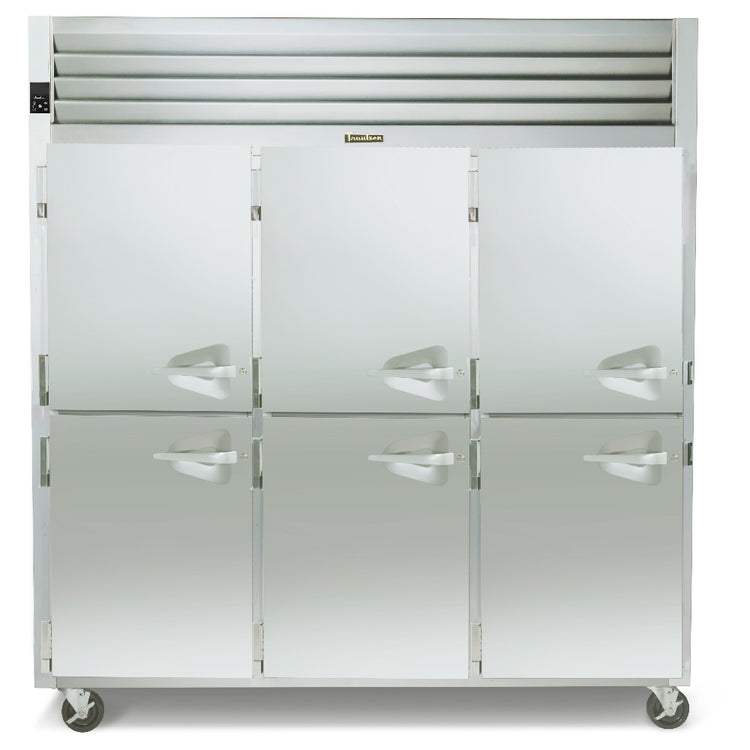 The Traulsen G31003 Dealer's Choice Storage Freezer is a versatile reach-in, three-section unit designed for optimal storage solutions. Featuring self-contained refrigeration and advanced microprocessor control with an LED display, this freezer offers precise temperature management. The stainless steel front ensures durability and a professional appearance, while the anodized aluminum sides and interior provide longevity and easy maintenance. Each section is equipped with three epoxy-coated shelves, maximizing storage capacity while supporting organization. Enhanced visibility is achieved through LED interior lights, and the unit's 6-inch high casters facilitate smooth mobility across various surfaces. Utilizing eco-friendly R290 Hydrocarbon refrigerant, this freezer is an environmentally responsible choice. The unit can be programmed to operate at temperatures as low as -10°F, catering to the diverse needs of food service operations. The half-height solid doors, all hinged on the left, ensure accessibility and energy efficiency. Certified by cETLus and ETL-Sanitation, the Traulsen G31003 meets rigorous industry standards, making it a reliable addition to professional kitchens, catering businesses, and food storage facilities seeking efficiency, sustainability, and robust construction.