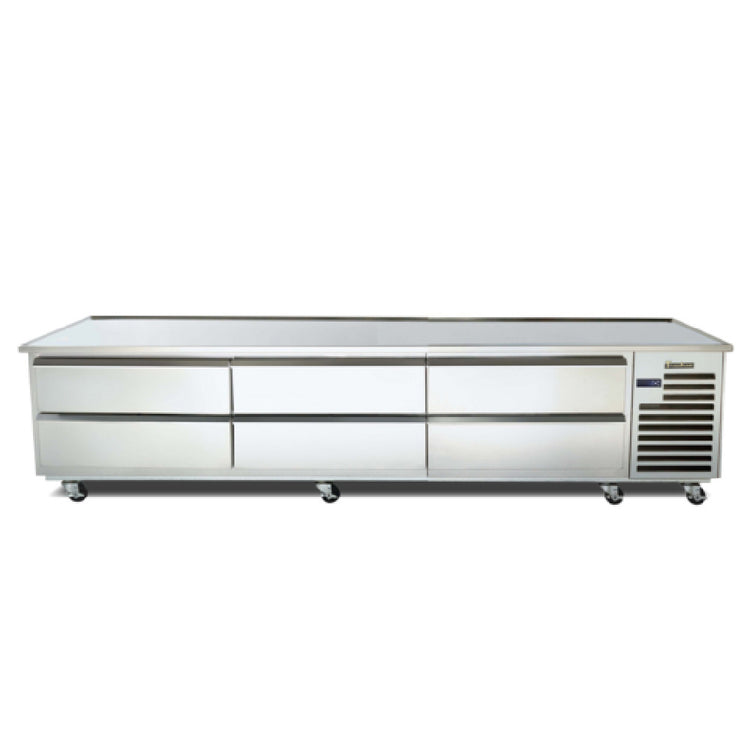 The Traulsen TE096HT Spec-Line Refrigerated Equipment Stand is an exceptional 96-inch long unit designed to accommodate a variety of food service operations. With the capacity to hold (12) pans measuring 12 inches x 20 inches x 6 inches deep, arranged front to back, it provides ample space for efficient organization and accessibility. This equipment stand includes (6) drawers, making it easy to sort and access stored items. Featuring self-contained refrigeration with microprocessor control, it ensures optimal temperature management for preserving the quality of contents. The stand is constructed with a stainless steel marine top and a stainless steel interior and exterior, offering durability and a sleek appearance. It is equipped with 4-inch casters for smooth mobility within your kitchen space. Powered by a 1/2 hp motor, this unit is both cULus and NSF certified, guaranteeing compliance with industry standards for safety and performance. The Traulsen TE096HT is particularly valuable for commercial kitchens, catering services, and other food service establishments that require reliable refrigerated storage solutions. Its combination of robust construction and advanced refrigeration technology makes it a practical choice for maintaining efficiency in demanding culinary environments.