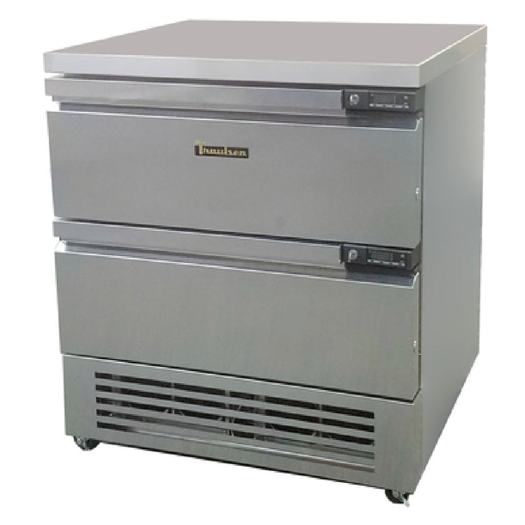 The Traulsen TF031D3 Spec-Line Flex Refrigerator and/or Freezer Equipment Stand is a versatile cooling solution designed to meet diverse commercial needs. With a compact 31-inch width and a 5.6 cubic foot capacity, this unit efficiently combines storage and refrigeration. Its bottom-mounted self-contained refrigeration system uses Hydrocarbon R290 refrigerant, operating at 2/5 HP and requiring a 115v/60/1-ph power supply, drawing 5.2 amps through a NEMA 5-15P cord. The unit features two locking drawers with removable ABS bins and two independent electronic controls, each with an LED temperature display for precision. Constructed with a robust stainless steel interior, top, front, and sides, and a galvanized steel back and bottom, it ensures durability and longevity in demanding environments. The 2-3/4" casters offer mobility and convenience. Certified by cETLus and ETL-Sanitation, the Traulsen TF031D3 is suitable for various industry segments, providing reliable refrigeration or freezing capabilities in a compact and durable form factor.