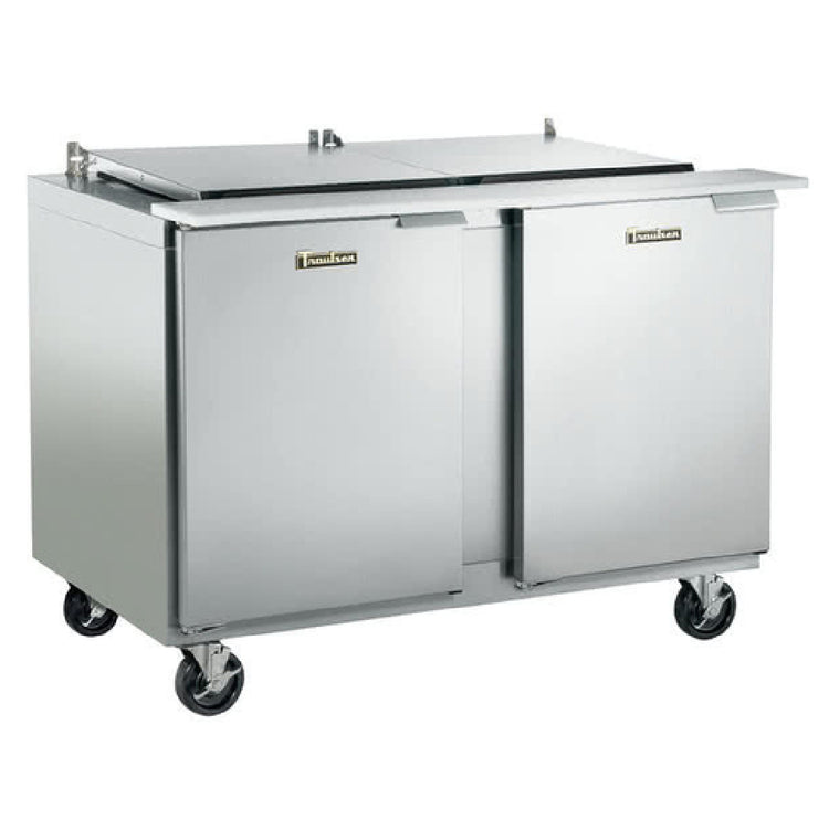 The Traulsen UST4818-RR-SB Dealer's Choice Mega Top Compact Prep Table Refrigerator with low-profile flat lid is a versatile refrigeration solution, ideal for commercial kitchens and food preparation environments. This reach-in, two-section unit spans 48 inches in width, offering a substantial capacity for efficiently holding 18 included 1/6 pans that are 4 inches deep, with the flexibility to accommodate pans up to 6 inches deep. Its design includes a full-length white reversible cutting board, enhancing its utility for food prep tasks. The refrigerator is constructed with a durable stainless steel top, sides, and back, along with a galvanized bottom and an anodized aluminum interior, emphasizing longevity and ease of maintenance. It features two stainless steel doors, both hinged on the right, facilitating convenient access to stored contents. The appliance is equipped with four shelves and is mounted on four 4-inch casters, ensuring mobility and stability. A rear-mounted, self-contained refrigeration system utilizing R290 Hydrocarbon refrigerant ensures efficient cooling, powered by a 1/4 HP motor. Certified by cETLus and ETL-Sanitation, the Traulsen UST4818-RR-SB is designed to meet rigorous industry standards, making it a reliable choice for diverse food service applications.