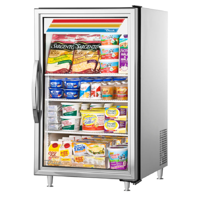 True Mfg. - General Foodservice, GDM-07-S-HC~FGD01, Refrigerated Merchandiser, countertop, True standard look version 01, (3) shelves, (1) Low-E thermal glass hinged door, LED interior lighting, door sign decal, stainless steel exterior, white aluminum interior with stainless steel floor, 2-1/2" legs, R290 Hydrocarbon refrigerant, 1/6 HP, 115v/60/1-ph, 1.9 amps, NEMA 5-15P, cULus, UL EPH Classified, CE, Made in USA, ENERGY STAR®