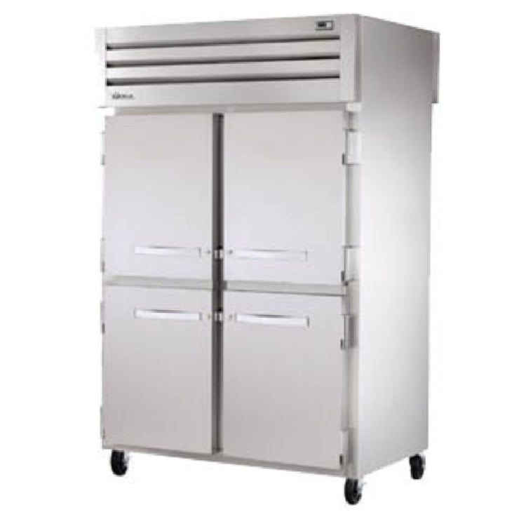 True Mfg. - General Foodservice, STG2RPT-4HS-4HS-HC, SPEC SERIES® Refrigerator, pass-thru, two-section, (4) stainless steel half doors front & rear with locks, cam-lift hinges, digital temperature control, (6) gray shelves, LED interior lights, stainless steel front, aluminum sides, aluminum interior, 5" castors, view spec sheet for electrical information & certifications, Made in USA