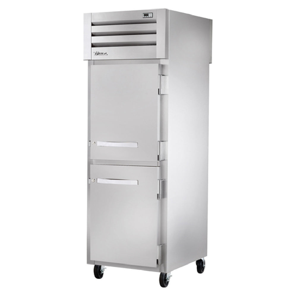The True Refrigeration STR1RPT-2HS-1G-HC SPEC SERIES® Refrigerator Pass-thru is a highly efficient and reliable refrigeration unit designed for commercial foodservice environments. This one-section pass-thru refrigerator features two stainless steel half doors at the front and a single glass door at the rear, all equipped with locks and cam-lift hinges for added security and ease of access. The unit boasts a robust digital temperature control system, ensuring precise regulation of internal conditions. It includes one interior kit and is illuminated by LED interior lights, enhancing visibility and ease of use. Constructed with a stainless steel front, sides, and interior, this refrigerator guarantees durability and longevity. The refrigerator stands on 5-inch castors, allowing for easy maneuverability within a busy kitchen environment. It utilizes the environmentally friendly R290 Hydrocarbon refrigerant and is powered by a 1/4 HP motor, operating at 115v/60/1-ph and drawing 3.8 amps. With a NEMA 5-15P plug, it is both cULus and UL EPH Classified, ensuring compliance with safety standards. Proudly made in the USA, this True Refrigeration model is an excellent choice for any commercial kitchen demanding high performance and reliability in its refrigeration solutions.
