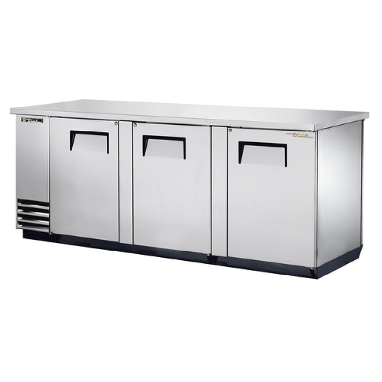 The True Refrigeration TBB-4PT-S Back Bar Cooler Pass-thru Three-section is a high-capacity solution designed for efficient beverage storage and accessibility. Measuring 90-3/8 inches in width, this unit accommodates up to 152 six-packs or four half kegs, making it ideal for busy bars and restaurants. Its design features six shelves and a left-side condensing unit, ensuring optimal cooling performance. The cooler's robust construction includes a stainless steel top and exterior, providing durability and a sleek aesthetic. Inside, the galvanized interior with a stainless steel floor ensures easy cleaning and longevity. The unit is equipped with six solid doors, each fitted with locks for security, and includes fluorescent interior lights for enhanced visibility. Operating with a 1/2 HP motor and requiring 115v/60/1-ph, it consumes 8.8 amps and is fitted with a NEMA 5-15P plug. The TBB-4PT-S is cULus and UL EPH Classified, affirming its compliance with industry standards. Proudly made in the USA, this back bar cooler offers a versatile and reliable refrigeration solution for the foodservice industry, catering to establishments seeking quality, performance, and efficiency.