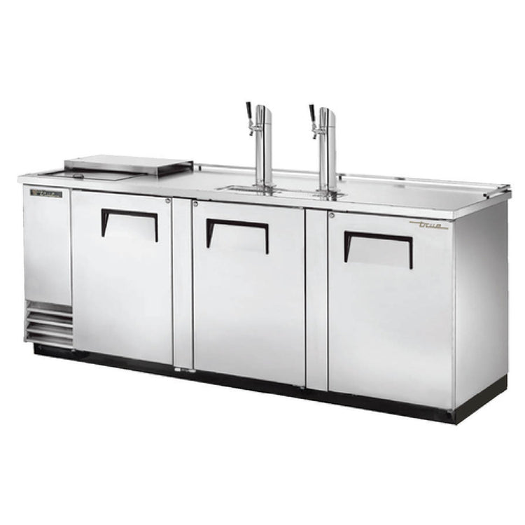 The True Refrigeration TDD-4CT-S-HC Club Top Draft Beer Cooler - 4 - 1/2 Keg Capacity is a premium solution for high-demand environments requiring efficient beverage service. Engineered with a stainless steel countertop and lid, this draft beer cooler is built for durability and ease of use. It features three solid hinged doors with locks, ensuring security and accessibility. A PVC-coated adjustable wire shelf provides versatile storage options. The unit is equipped with two 3-inch diameter insulated beer columns, each with a single faucet draft arm for efficient beverage dispensing. The anodized aluminum glass rail adds a touch of elegance and functionality, while the stainless steel front and sides enhance its robust exterior design. The interior includes a galvanized finish with a stainless steel floor, offering enhanced durability and cleanliness. Powered by R290 Hydrocarbon refrigerant, this cooler showcases energy efficiency with a 1/4 HP motor, operating at 115v/60/1-ph and 2.8 amps, compatible with a NEMA 5-15P plug. It is cULus and UL EPH Classified, complying with safety standards, and bears the ENERGY STAR certification, indicating superior energy performance. Made in the USA, this cooler represents a reliable choice for bars, restaurants, and clubs seeking quality and efficiency in draft beer service.